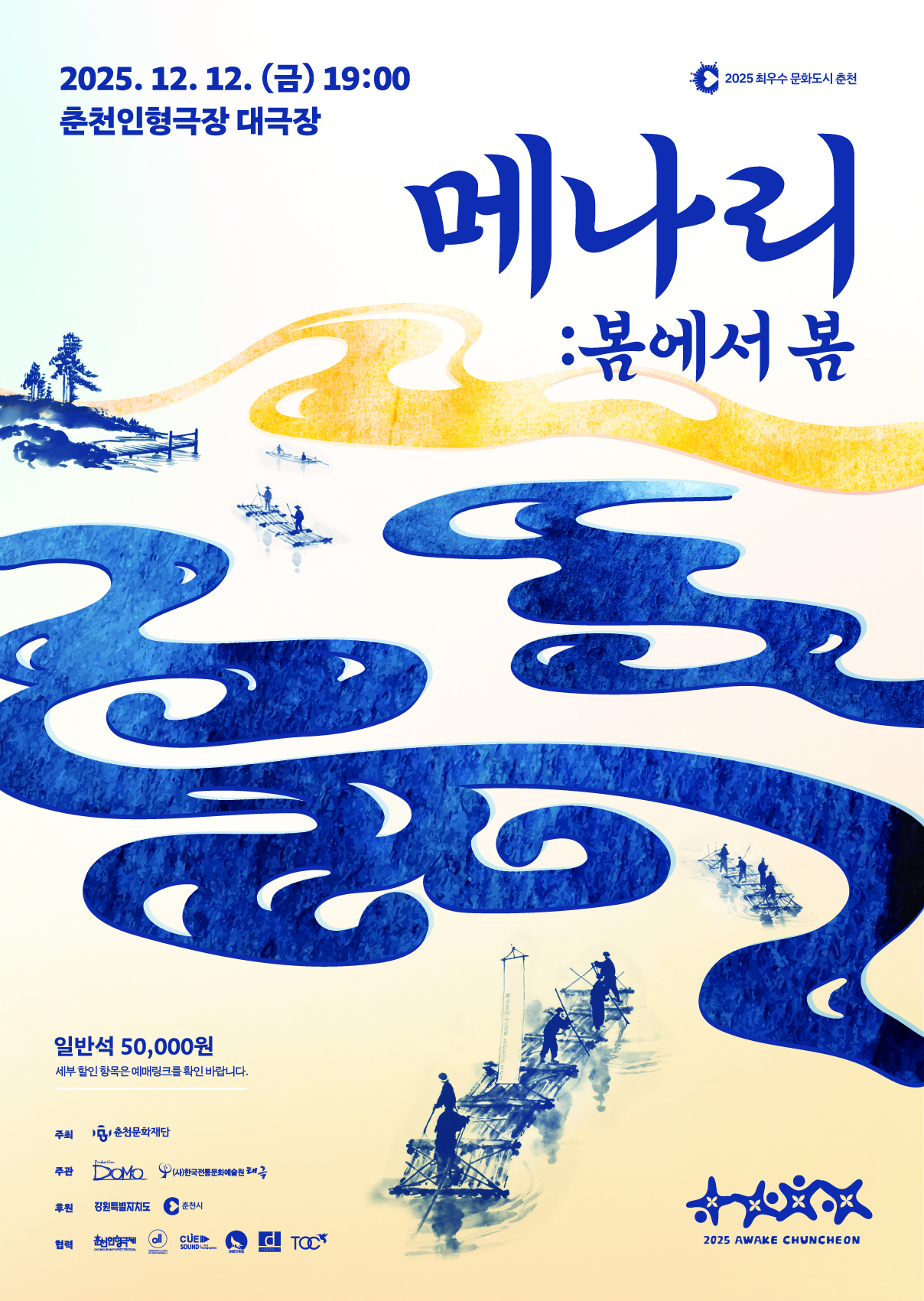 <메나리:봄에서 봄>삶의 리듬, 그 끝없는 순환의 이야기북한강 물길 따라 모여든 뗏군과 뱃사공들,그들의 일상 속 숨결과 노래,그리고 생의 굴곡을한국 전통 타악의 리듬과 춤으로 풀어냅니다.만남에서 제례로, 폭우 속 소나기로,감사와 상실을 지나 다시 맞이하는 봄.삶과 죽음, 이별과 부활이 맞닿은순환의 리듬 속으로 여러분들을 초대합니다.한국 전통의 메나리 가락이현대의 무대로 피어나는 순간,그 소리의 울림이 여러분들의 가슴에도 봄을 틔웁니다.